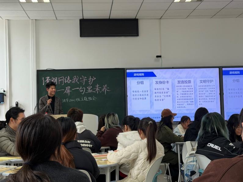 为引导班级成员自我审视网络行为习惯,认识行为边界与责任,增强文明意识,提升理性、负责、温暖的数字公民素养,共筑清朗有序的网络环境,法学2401班于2026年3月19日在博学西楼103教室开展“清朗网络我守护,一屏一句显素养”主题班会。