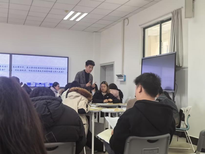 “案件真相”公布后,同学们积极分享个人体会。周毕韬同学阐述了自己与剧本角色类似的因教务系统问题而带来的困扰,并对教务系统的进一步优化改进提出了详细可行的解决方案;杜洋蓥同学就如何避免出现类似情况分享了自己的见解与建议;朱怡玮和周勋哲同学则针对“案件”中可能涉及的违法之处进行深度解析,展现了法学生的专业素养。