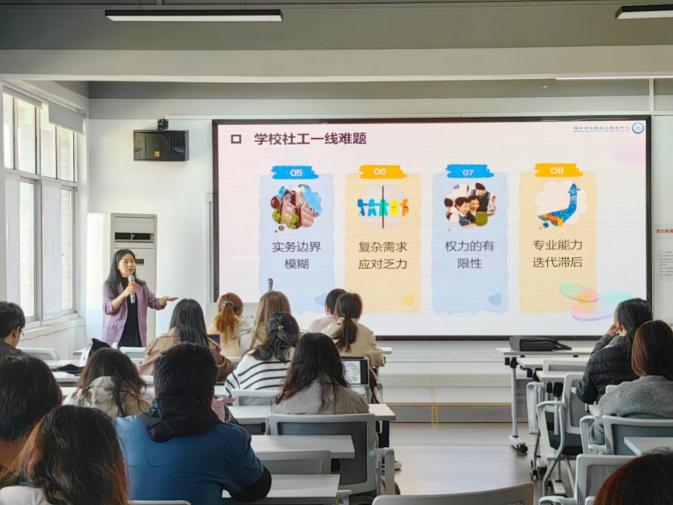 任海卫从一线实践中的身份定位、资源整合等核心挑战切入,系统梳理了学校社工面临的现实难题。她重点分享了深圳在实践中形成的“体系化、标准化、协同化、整合化、项目化”服务模式,强调其核心在于通过构建多层次服务网络和标准化流程,依托跨部门协同,实现“家-校-社”资源的有效整合。在服务策略层面,任海卫提出学校社工应注重服务内容与学校德育体系、教学安排及治理目标的深度契合。她认为,服务的精准性与创新性是提升成效的关键,并结合多个项目案例分享了在生命教育、特殊学生支持等领域形成的实践经验。此外,她还解读了深圳市近期出台的多项社工行业政策,邀请在座学生投身到社工行业中。